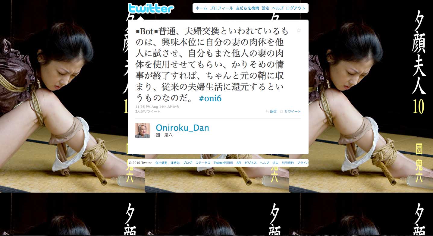 ツイッターで団鬼六氏をフォローしているんだが、氏の背景画像を見て不覚にも欲情した。何て言うんだろう、征服欲的な意味で。今まであまり意識しなかったが、いや否定すらしていたのかも知れないが、どうやら俺にも征服欲や支配欲はあるようだ。…俺、やっぱSなんかなぁ。